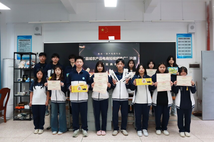 当青春技能遇上县域农产,当镜头语言传递乡土情怀,为期10周的揭西县第一职业技术学校电子商务专业“县域农产品电商短视频推广”第二课堂活动,在掌声与收获中圆满落幕!12月29日下午,活动颁奖仪式顺利举行,6位电商专业教师与全体获奖学生齐聚一堂,共同见证技能成长,分享助农喜悦。
